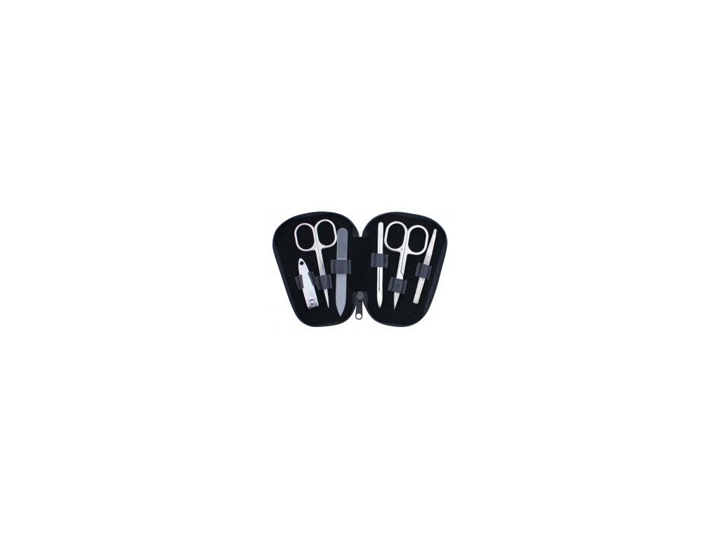Elegantní koženkový manikúrní set 6-dílný, z nylonu s motivem květů. Pouzdro se uzavírá na zip, je naplněn manikúrním náčiním značky DUP a skleněným pilníkem.