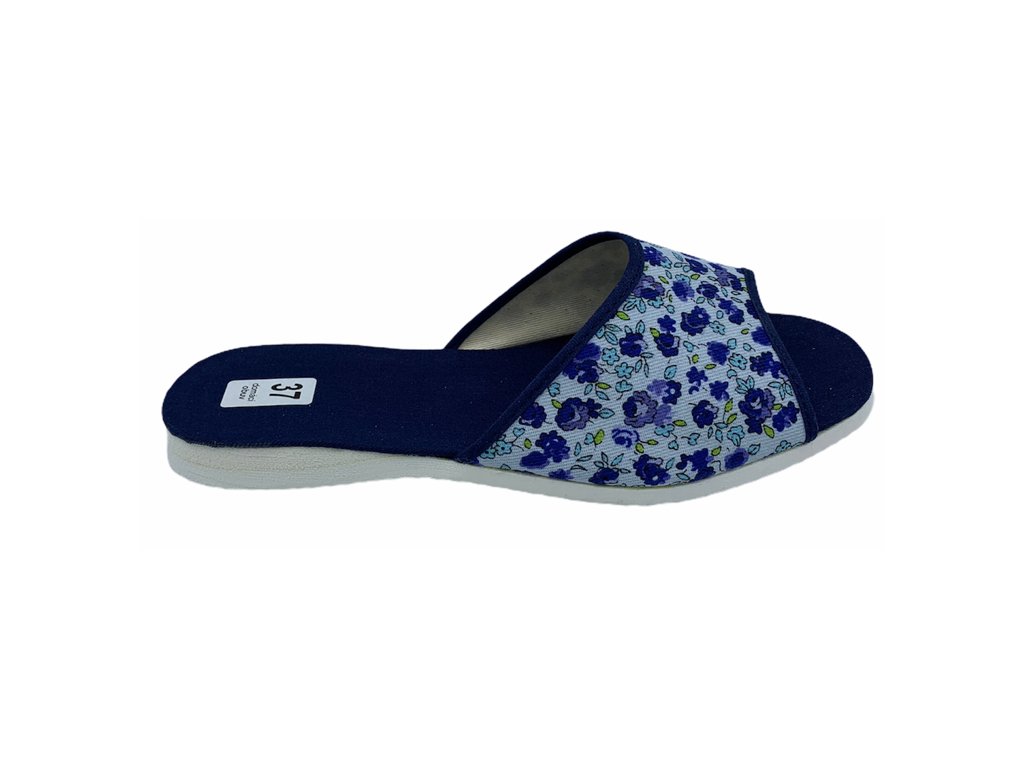 Svršek a stélka boty jsou vyrobeny z textilie. Vrchní část je dekorována růžovými květinami na fialovém pozadí. Pantofle jsou velice odolné a při chůzi pohodlné.