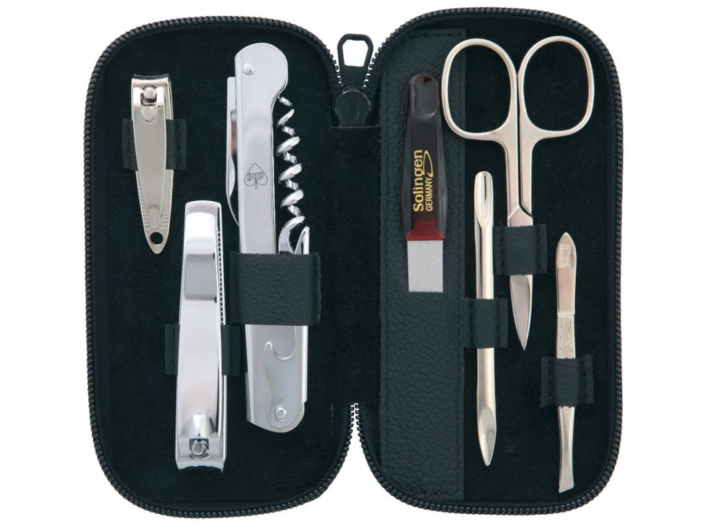 Pánská manikúra vyrobená z černé kůže obsahuje manikúrní náčiní značky DUP a Solingen. Uzavírá se zipem a je vhodná pro všechny pány.