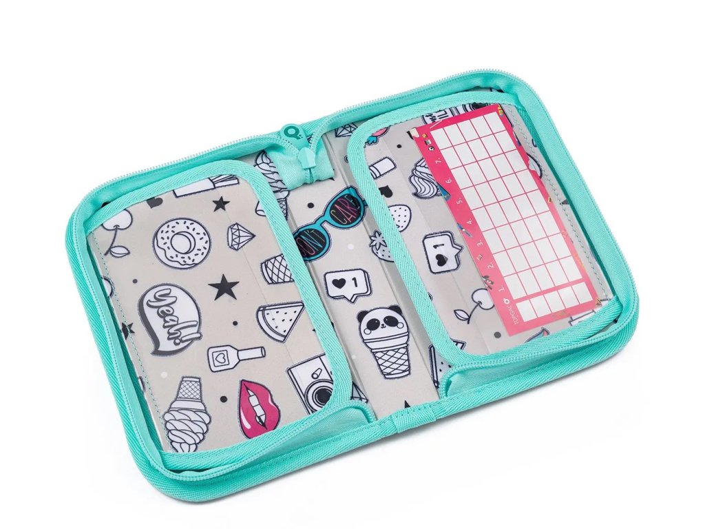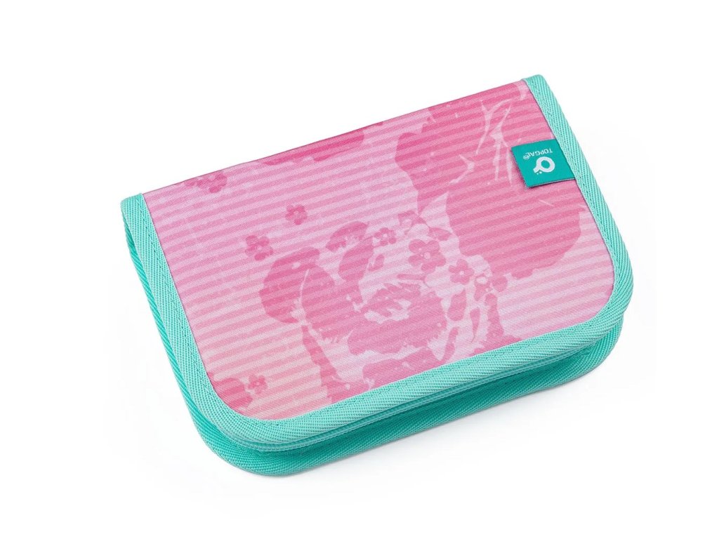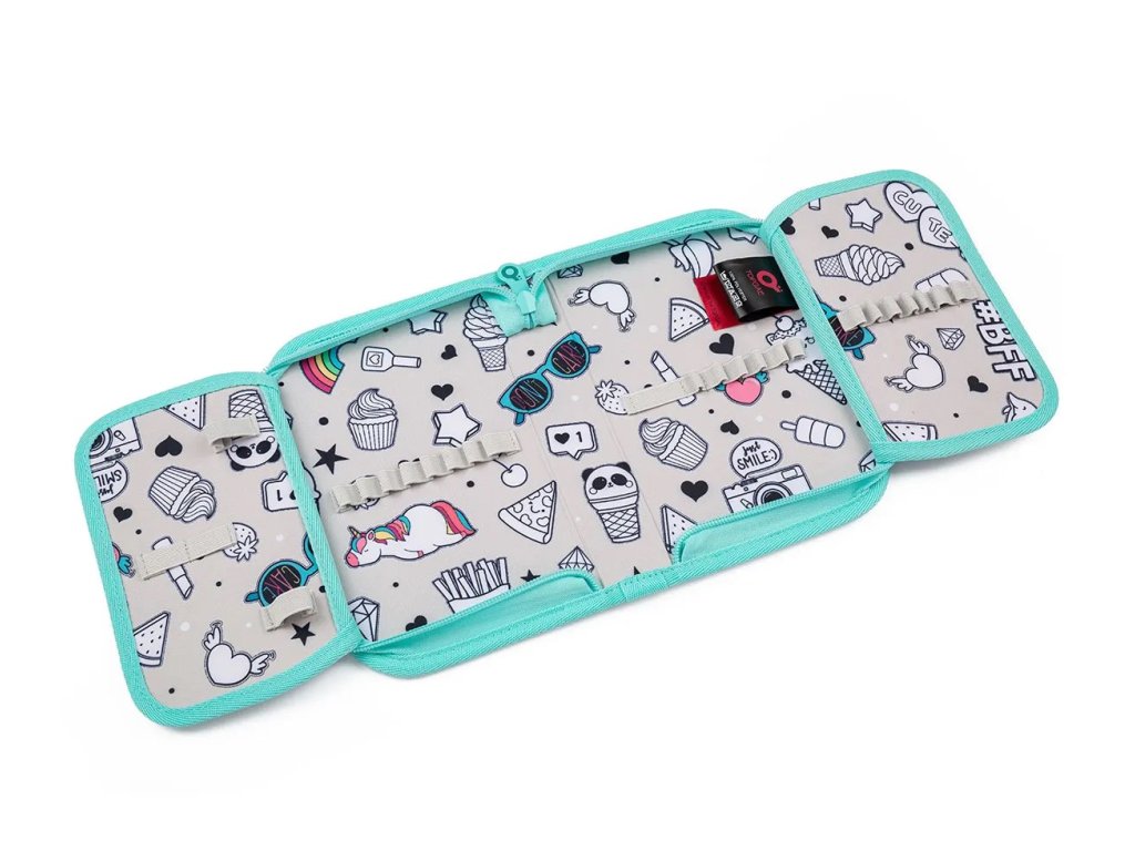 Jednopatrové školní pouzdro se dvěma klopami. Díky gumovým úchytům se do nich vejde celkem dvacetjedna pastelek, tužek a fixek. Tři širší úchyty poslouží na pravítko, kružítko či nůžky. Dva větší na gumu a ořezávátko.