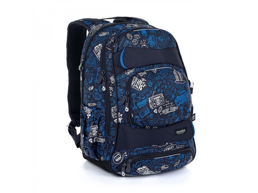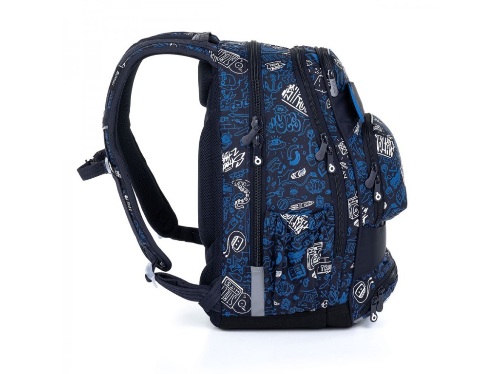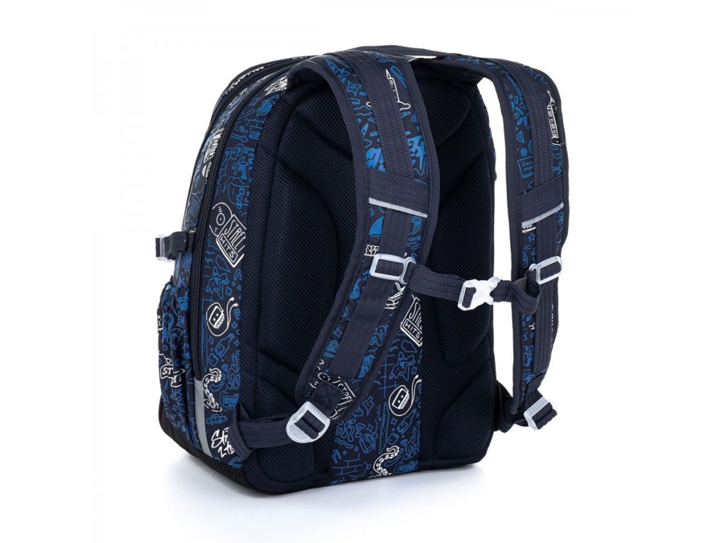 Modrý studentský batoh s drobnými modrobílými obrázky ala doodle art.