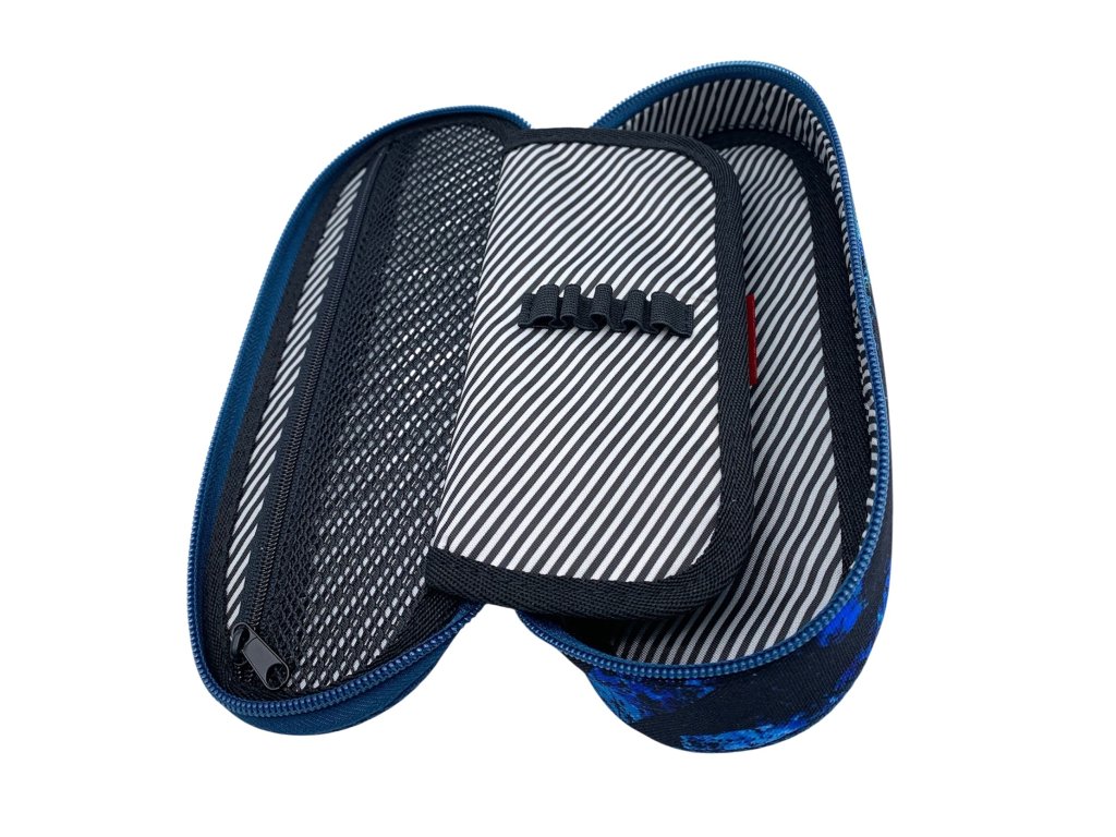 Oválný penál na všechny potřebnosti pro středoškoláky a starší školáky na druhém stupni ZŠ. Uvnitř pouzdra je síťová kapsička na zip a klopa, na níž jsou umístěny gumičky pro uchycení celkem devíti tužek a propisek, které je potřeba mít přehledně uspořádané a po ruce. Prostor pod klopou pak umožňuje volně umístit další psací potřeby – pastelky, fixy, prostě cokoliv potřebujete.